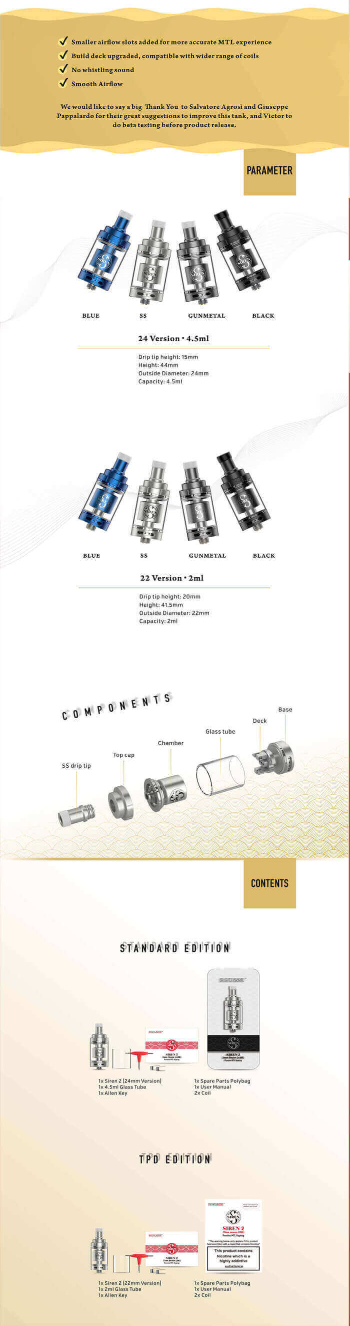 Siren v2 fiyat ve performans ürünüdür. Tasarımında fikir sahibi olan yapımda büyük emekleri geçen kişi şöyle anlatıyor; ' Siren v2 MTL Atomizerin aroma konusunda üst düzey başarılı başarılı olabilmesi için deck'in üzerinde yer alan hava kanallarının hava akımını düz bir şekilde coile çarparak bir basınç oluşturması ve böylece ısınarak buharlaşan likitin aromasını ve lezzetini kaybetmeden size ulaştırması en önemli unsurdu. Deck'in içinden geçen basınçlı ve sıkışmış hava coilde yeterli basıncı oluşturamaz ise buharlaşan likitinizdeki aroma yanma odasındaki iç çeperlere yapışıp kalacak ve aromada düşüklüğe sebep olacaktı.'