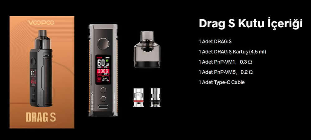 DRAG S, 0,2 Ω ve 0,3 Ω'luk iki PnP coilleriyle donatılmıştır. Aroma ve buhar performansı üstün başarı sağlar. PnP-VM1, PnP-VM5 kutu içeriğinden çıkmaktadır.